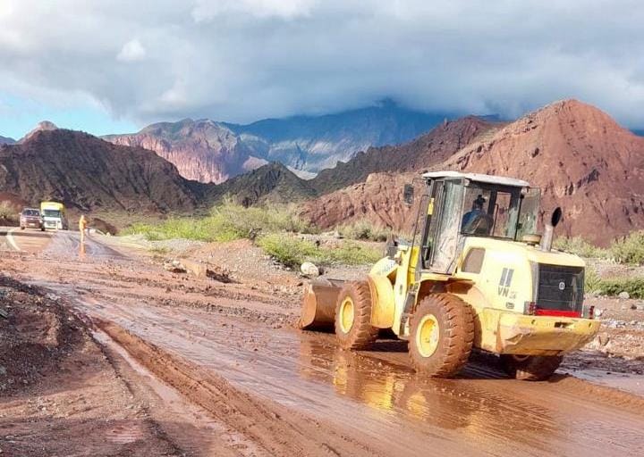 Asimismo, personal y maquinaria vial se encuentran trabajando intensamente en las tareas de despeje y limpieza de piedras y rocas sobre la calzada, desde el sector de El Anfiteatro (km 45) hasta la localidad de Alemania (km 80). En el operativo intervienen equipos pesados, entre ellos cargadora frontal y motoniveladora, que ejecutan desvíos y remoción del abundante material depositado sobre la ruta.